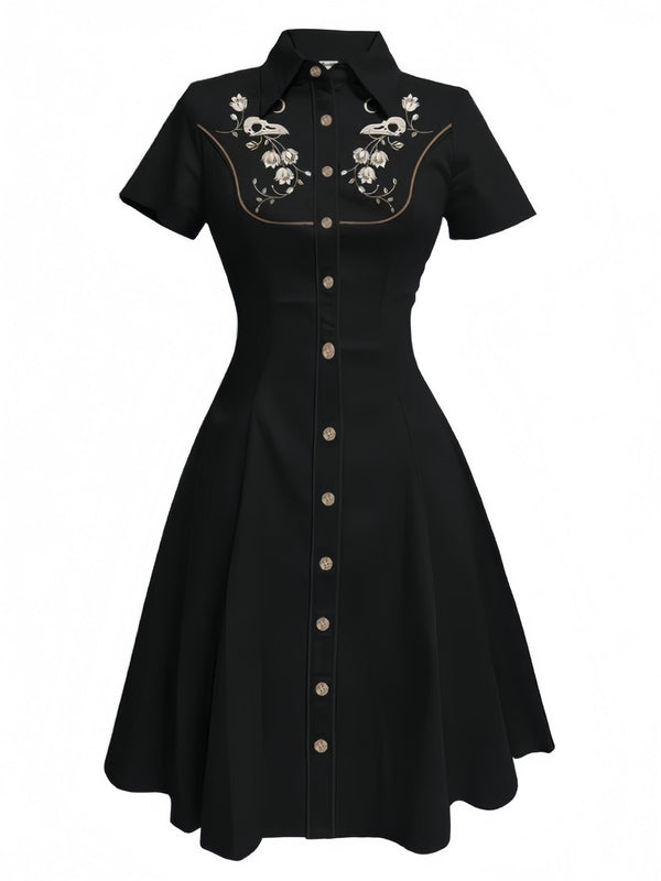 Robe noire en coton brodée de fleurs western années 1940 – Retro Stage-France