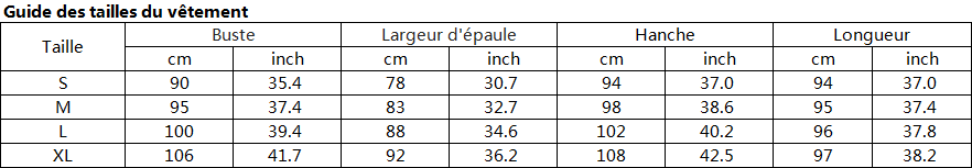 Remarque : Les mesures des tableaux de vêtements peuvent varier en fonction des produits ou des fournisseurs.