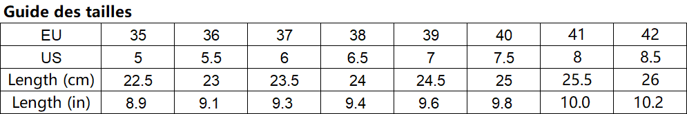 Remarque : veuillez comparer les tailles de détail avec les vôtres, assurez-vous de choisir la bonne taille avant l'achat. Si vos pieds sont un peu gros et larges, il est recommandé de choisir une taille plus grande, merci.