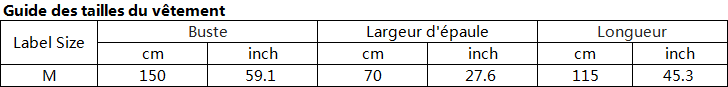 Remarque : Les mesures des tableaux de vêtements peuvent varier en fonction des produits ou des fournisseurs.