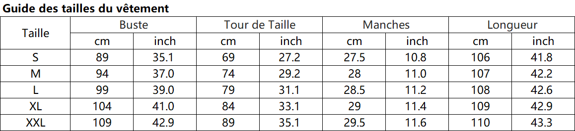 Remarque : Les mesures des tableaux de vêtements peuvent varier en fonction des produits ou des fournisseurs.