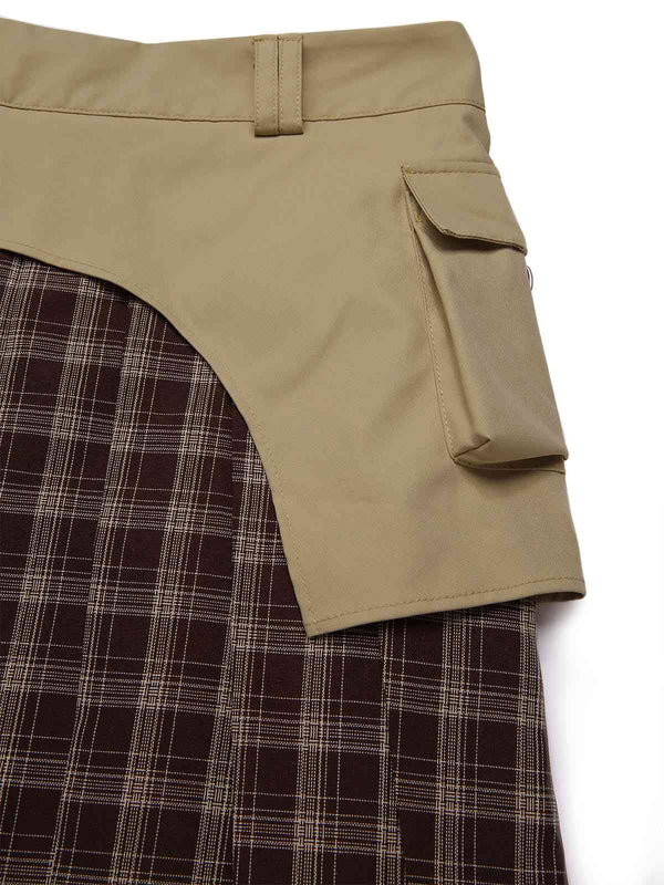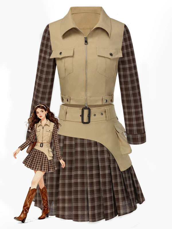 [Pré-vente] 2PCS Veste patchwork à carreaux et jupe plissée kaki et marron années 1960