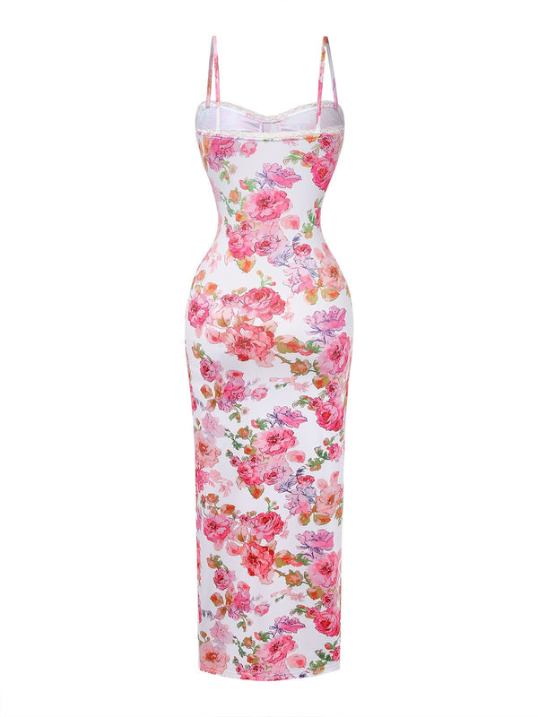 Robe longue moulante bretelles floral rose 1980s – Retro Stage-France