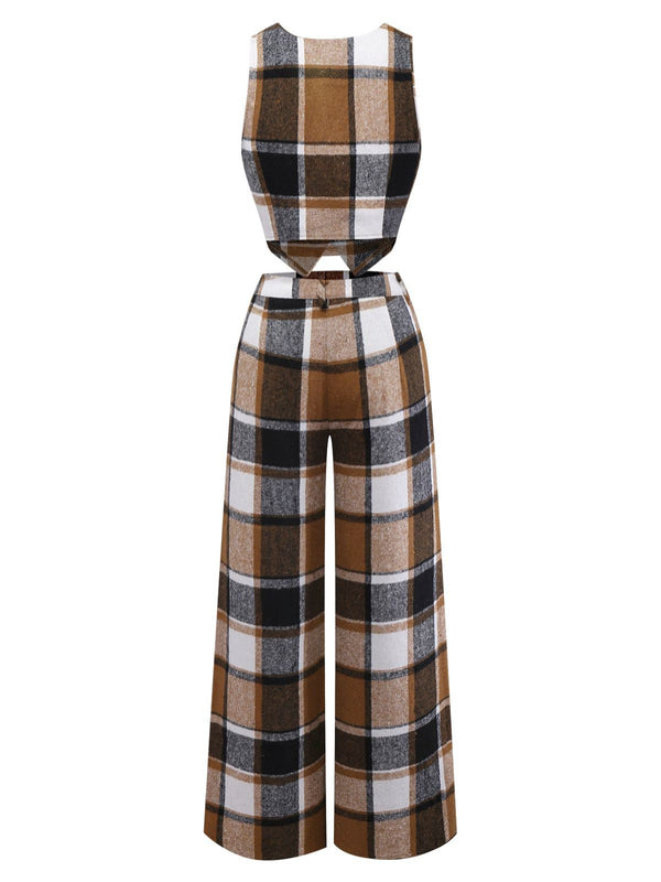 2PCS Gilet sans manches et pantalon à carreaux en fausse laine kaki des années 1950