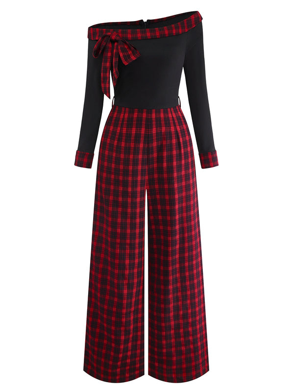 [Pré-vente] Combinaison rouge épaules dénudées patchwork à carreaux et nœud années 1940