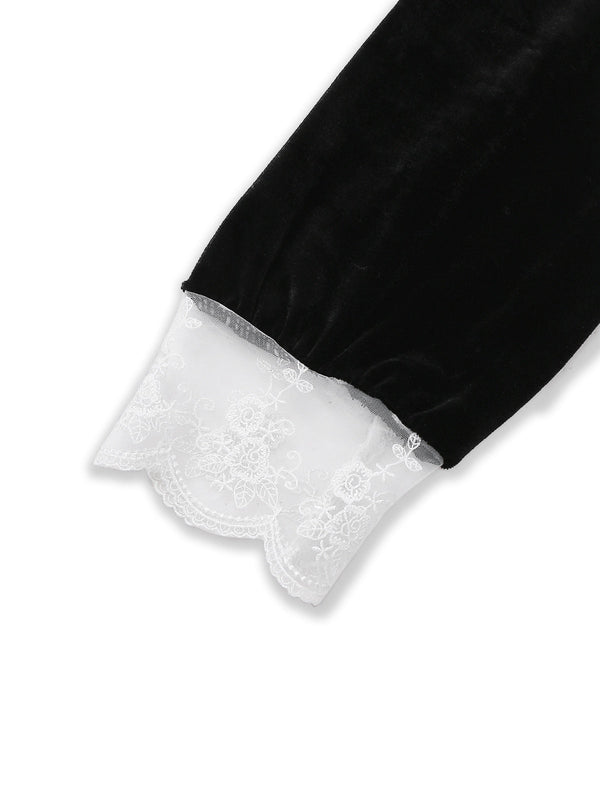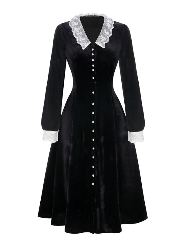 [Pré-vente] Robe en velours noir col en V et revers en dentelle des années 1940
