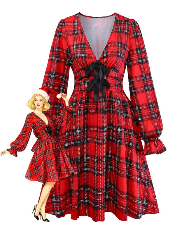 Robe rouge à carreaux et nœud col en V profond manches lanternes des a – Retro Stage-France