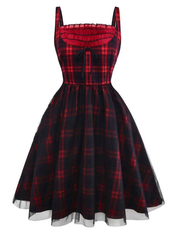 [Prévente] Robe rouge et noire en résille à carreaux avec nœud années 50