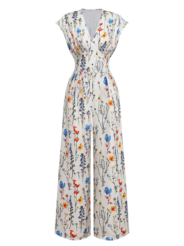 Combinaison beige à fleurs à manches courtes et col en V années 1950 – Retro Stage-France