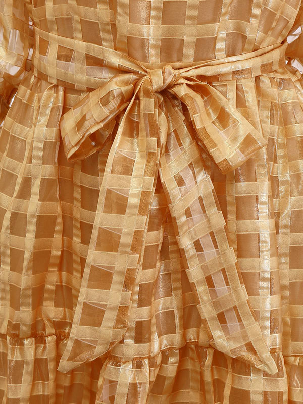 Robe de soirée mi-longue manches bouffantes en maille dorée des années 1940