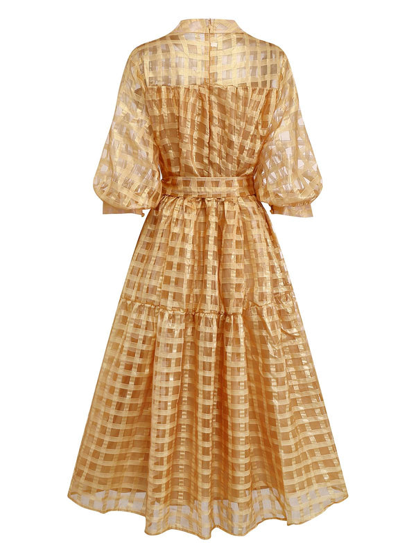 Robe de soirée mi-longue manches bouffantes en maille dorée des années – Retro Stage-France