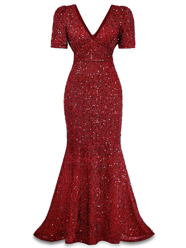 [Prévente] Robe sirène longue à paillettes et nœud rouge vin années 30