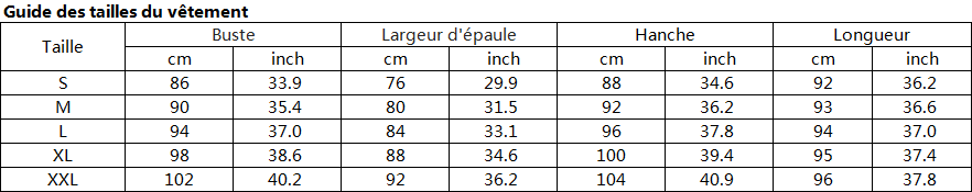 Remarque : Les mesures des tableaux de vêtements peuvent varier en fonction des produits ou des fournisseurs.
