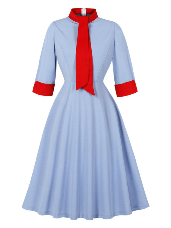 Robe bleue col montant et nœud contrastant années 1950 – Retro Stage-France