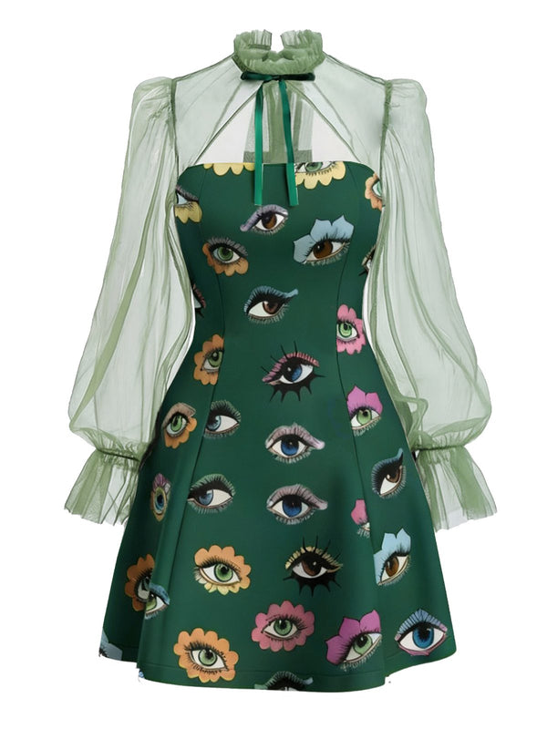 Robe verte manches en maille imprimé œil gothique Halloween années 1960