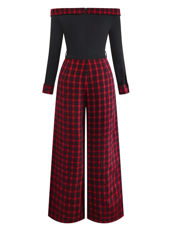 [Pré-vente] Combinaison rouge épaules dénudées patchwork à carreaux et nœud années 1940