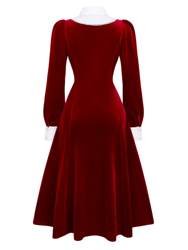 [Prévente] Robe rouge en velours en col chemise et nœud années 40 – Retro Stage-France