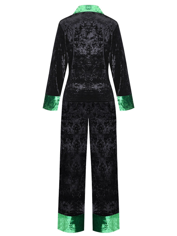 Ensemble pyjama en velours scintillant vert et noir avec col cranté an – Retro Stage-France