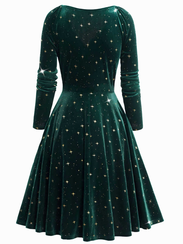 Robe en velours col en V et étoiles vert foncé des années 1940