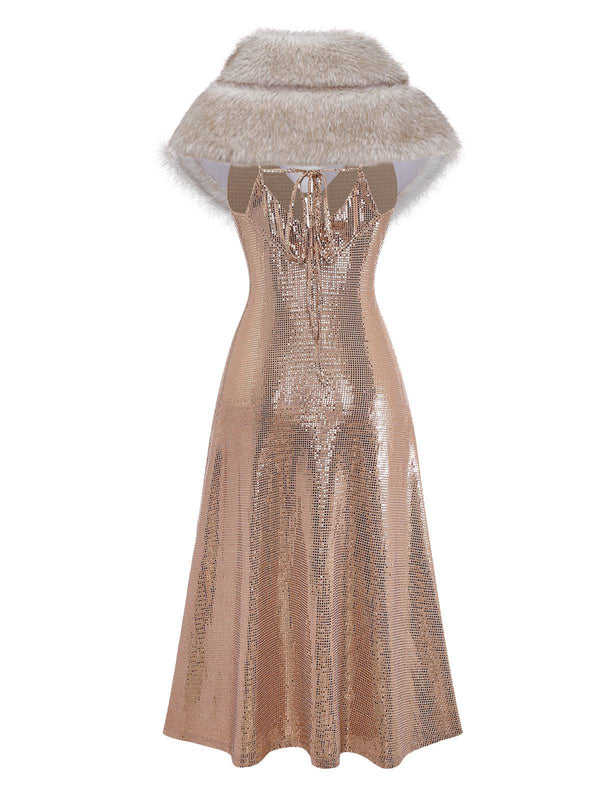 [Prévente] 2PCS robe à paillettes et châle en fausse fourrure marron années 1920