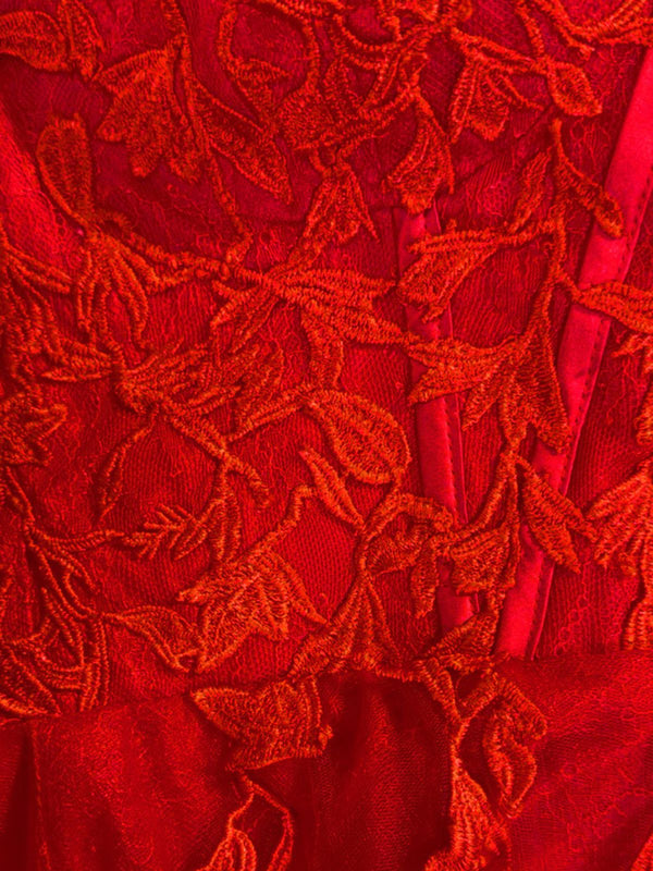 Robe longue rouge en tulle et dentelle à fines bretelles des années 19 – Retro Stage-France