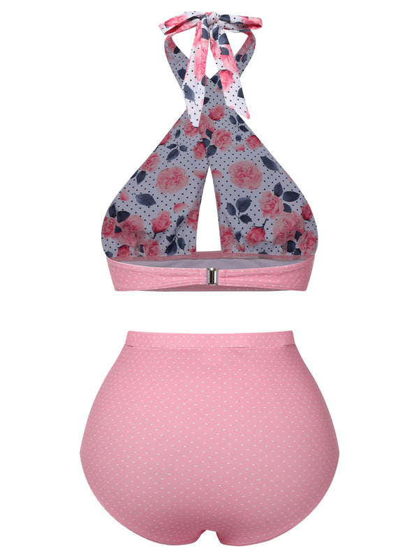 Maillot de bain rose à col croisé et imprimé floral des années 1940